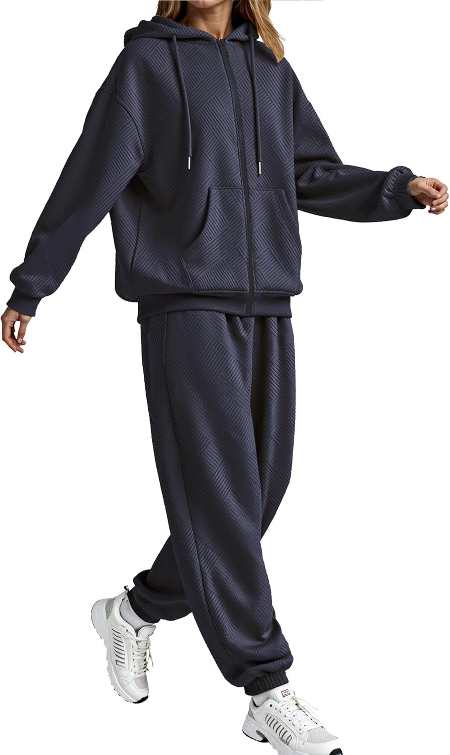 - Design Details: Drop-shoulder hoodie with roomy kangaroo pockets + adjustable drawstring hood; High-waist joggers featuring an elastic waistband, drawstring, and side pockets for a flattering, customized fit