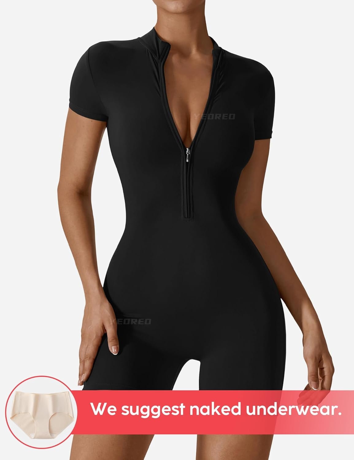 Women Short Sleeve Workout Jumpsuit Zip Up Romper Bottom Shorts Bodysuit Bodycon Sexy One Piece