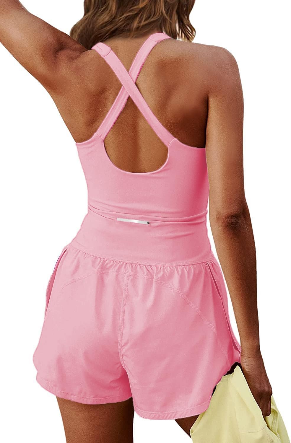 - 【Features】Sleeveless tank top, onesie, cross back design, running outfit, built in shorts, athletic one piece shorts, workout romper, running romper for women, one piece jumpsuits for women, womens workout shorts romper
